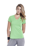 Deep V-neck. Modern fit in feminine contour. A technical blend of micropoly with the natural, soft hand of cotton and the luxury drape of rayon. Fashionable and functional. Inherent moisture wicking. Tear away label. TriTec